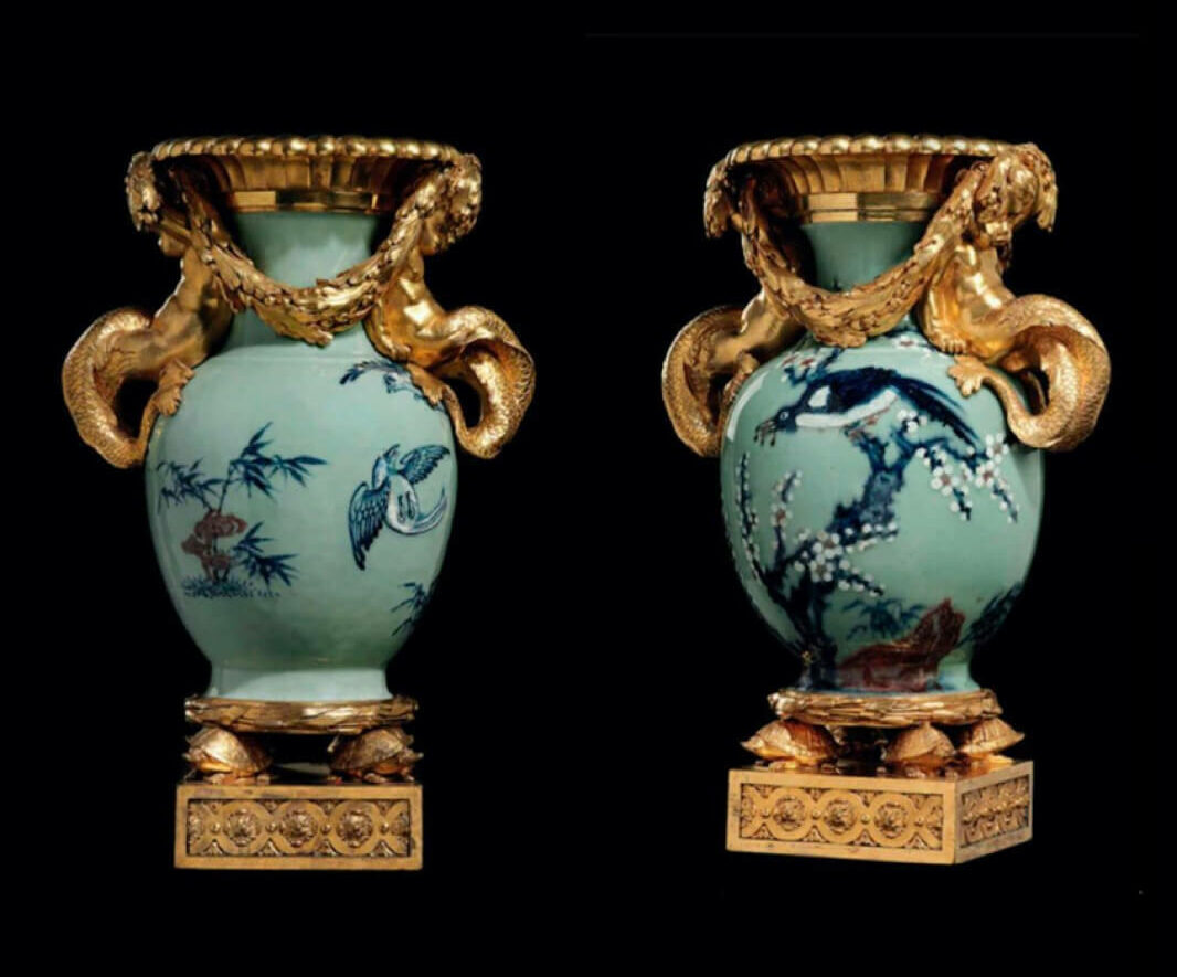 Ces vases Qianlong, ornés de montures en bronze doré de Pierre Gouthière (1732 – vers 1814), le plus grand bronzier de la période de Louis XVI, ont probablement appartenu au célèbre peintre français François Boucher.