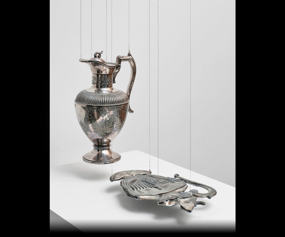 Two silver-plated objects, one flattened by a 250 ton press, suspended on metal wire