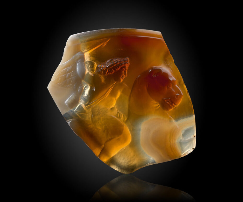 This Graeco-Roman fragment of a cameo-cut cup, originally approximately 6.5 cm high and 10 cm in diameter, was created circa 100 BC – AD 100 and preserves an image of Eros riding a panther - the Dionysian animal par excellence. In later representations, Eros riding panthers and other animals are often associated with the Seasons, but in earlier works they appear in more strictly Dionysiac contexts— appropriate on a luxurious drinking vessel such as this one.