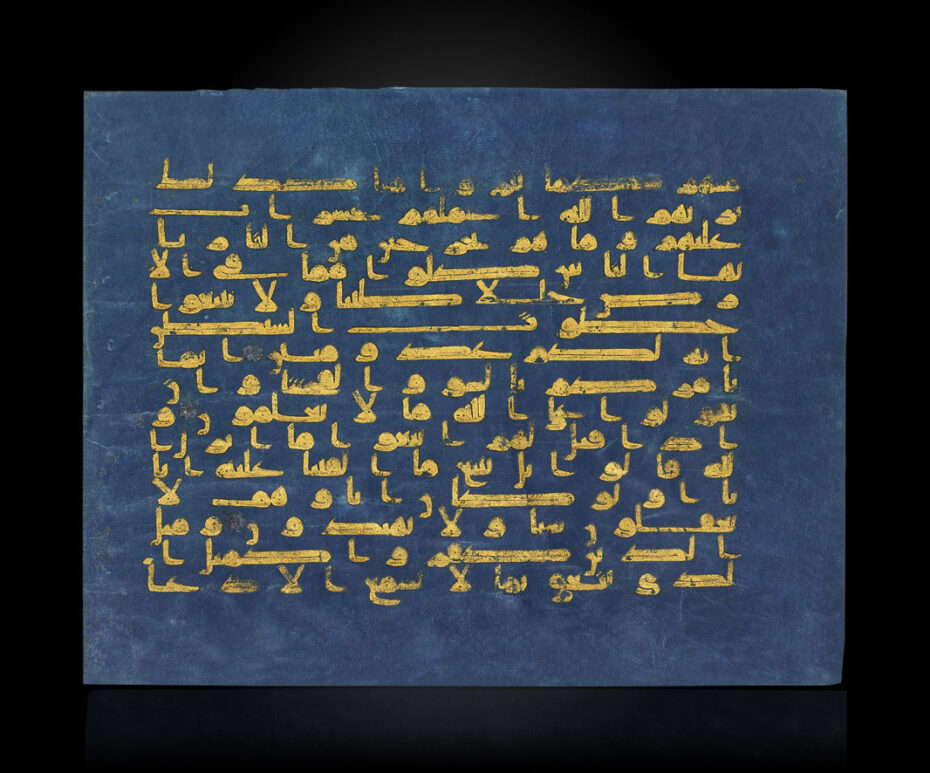 This folio originates from one of the best-known and most striking manuscripts of the Qur’an from the early medieval Islamic world. The rich contrast of gold script on indigo parchment, the large size, and the relatively good condition of this and other folios from the manuscript have established it as an iconic example of early Islamic religious art. The origins of this mesmerising manuscript have been debated by scholars for over a century, and suggestions have ranged from Abbasid Baghdad to Fatimid North Africa and Umayyad Spain. The most recent research has linked the production of this manuscript and its distinctive colour scheme to a programme of legitimisation under the Umayyad Caliphs of Cordoba in Southern Spain in the 10th century, specifically the patronage of the Umayyad Caliph al-Hakam II (r. 961–976 AD).