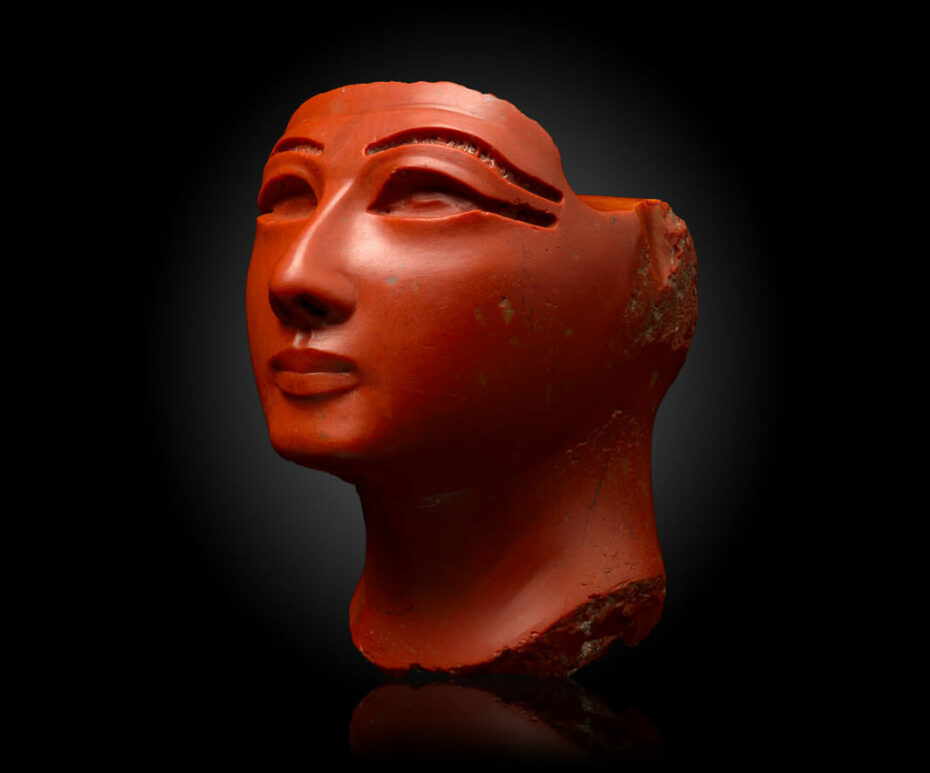 This head, from a composite statue assembled from parts, would have been completed by a faience crown and bronze beard. Attributes and materials identify the portrait as a royal figure, possibly Hatshepsut, who ruled Egypt c. 1479-1458 BC. The jasper is an exceptionally pure red, whose colour symbolised life and vitality.